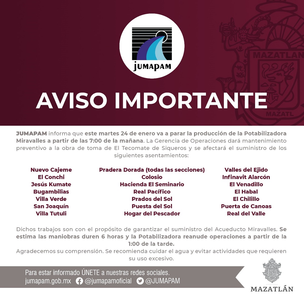Según ha informado la Junta Municipal de Agua Potable y Alcantarillado, las colonias afectadas son las de la zona norte de Mazatlán.