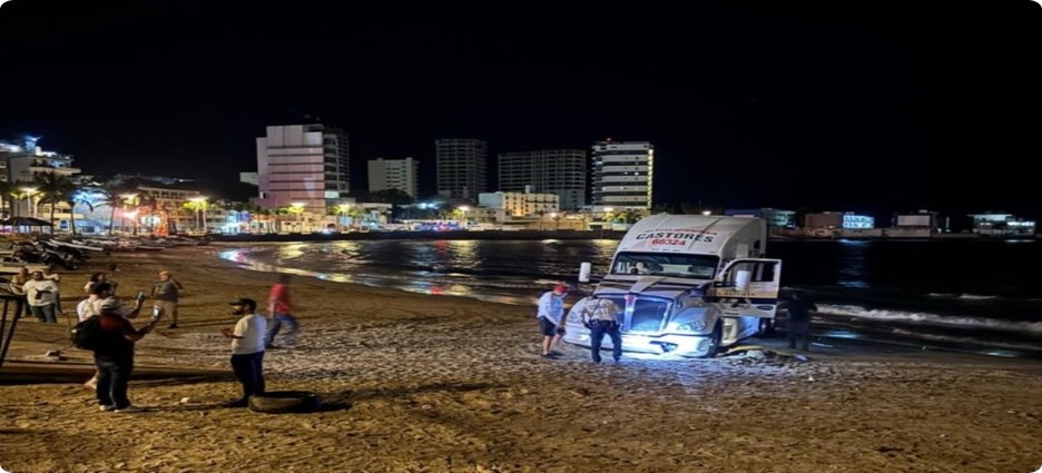 El incidente ocurrió en la noche, cuando el chofer condujo el tractocamión sobre la arena utilizando una rampa de acceso, pero la unidad terminó embancada por el peso y la blandura del terreno, lo que llamó la atención de paseantes y residentes.